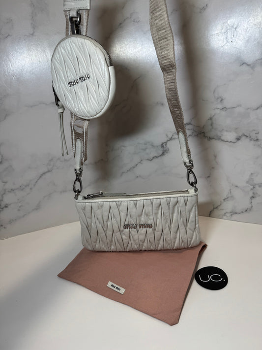 Miu Miu Quilted Matelasse Clutch Crossbody Bag with Logo Strap, Ivory