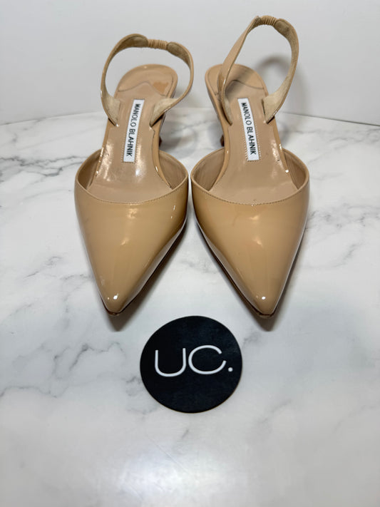 Manolo Blahnik Carolyne Kitten Heel Halter Pumps. Beige. Size 37.