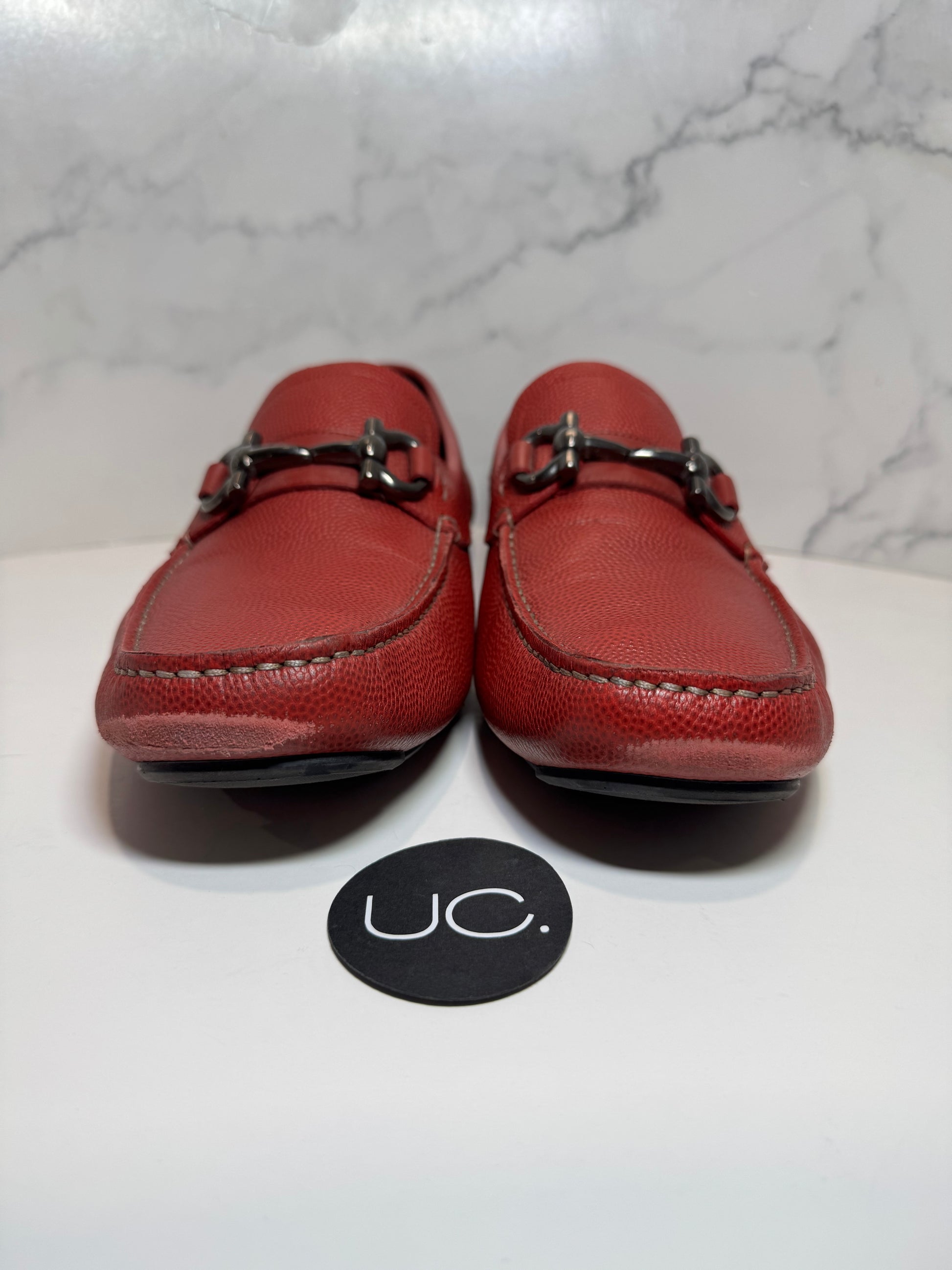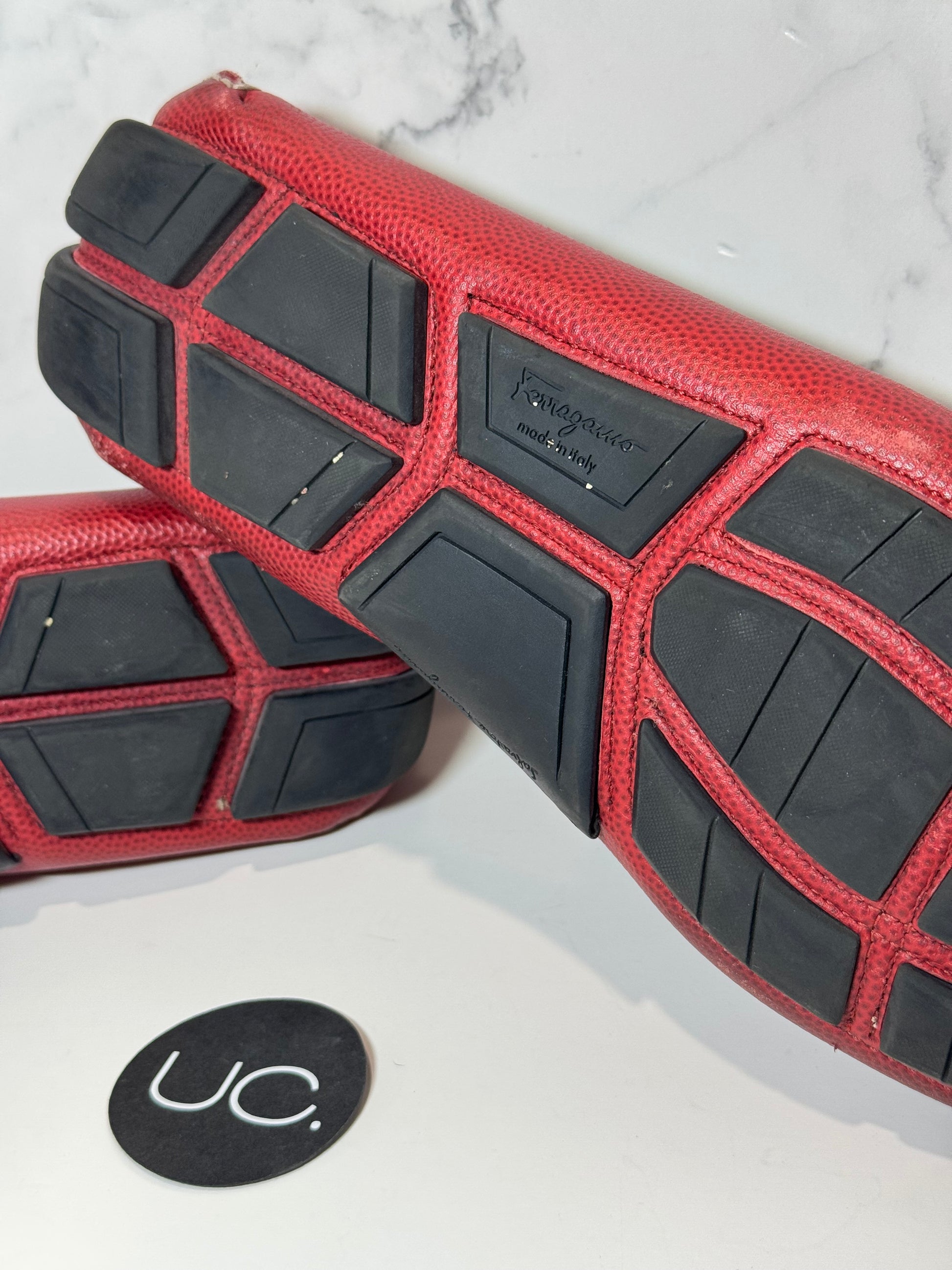 Ferragamo Parigi Loafers. Red. Pebble Calf Leather. Size 9.5. See photos for wear. Insoles and bottom soles are in great shape! Original Retail: $795. Uncommon Collective is a reseller of pre-loved designer goods. We are not associated with any of the brands we sell.
